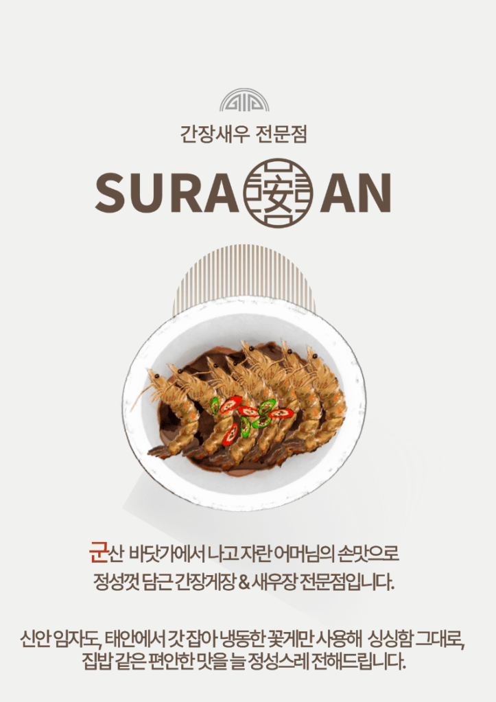 수라안 간장새우 양념새우 전문점 주 문 하 기 MAIN MENU 수라안 정성을 다한 프리미엄 간장새우 운영 시간 월 – 토 11:30 am – 21:00 브레이크타임 15:00pm – 17:00 매주 일요일 정기휴무 오프라인 매장 31버들로 19번길중앙동북구, 광주광역시 61239대한민국 문의(고객센터) 010-5894-6505 062-521-6550 좋아하기 가져오는 중...